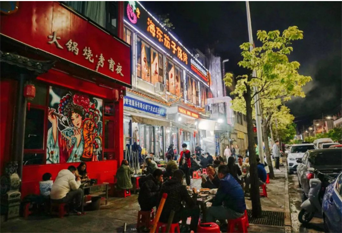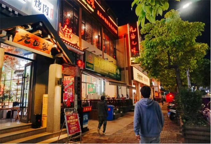 燒烤、火鍋、烤肉、牛蛙、小龍蝦、烤魚、小吃……各色廣受年輕人歡迎的美食品類一家緊接著一家。