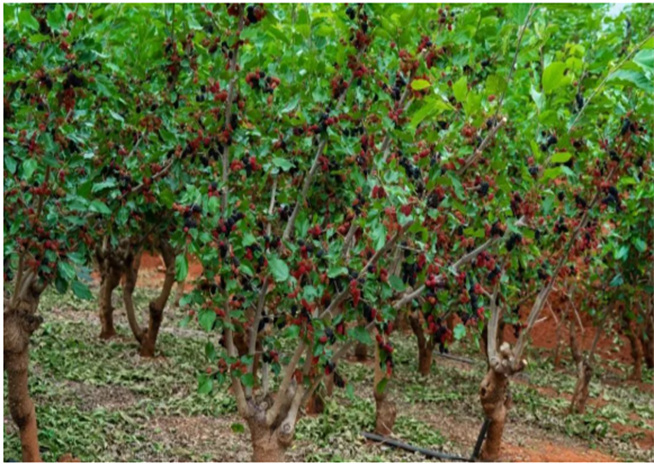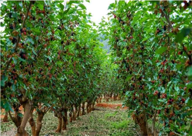 在三川一帶,最是愛(ài)種桑葚。但連畝成片,規(guī)模大的并不容易尋,位置好找且品種多的桑葚園,在程海高速出口(哨丫口),往梁官方向五百米處就有一塊。