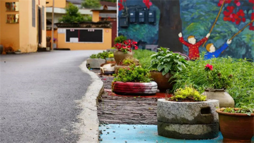 沿著瀝青路往村里走,干凈整潔的街道旁,利用老舊水缸、廢棄石磨等搭建的花臺(tái)里,各色花卉迎風(fēng)擺動(dòng)。