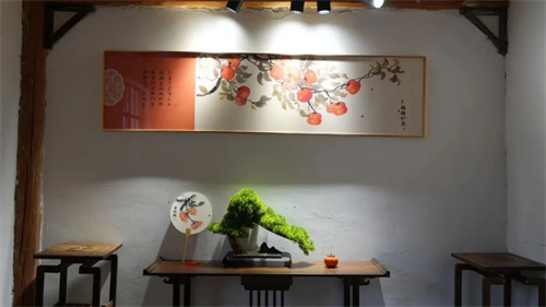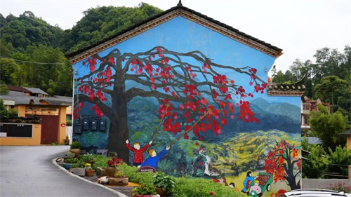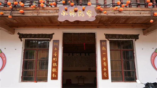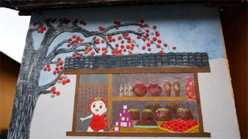 具有鄉(xiāng)愁元素的黃墻黛瓦傳統(tǒng)民居上,“村和萬柿興”“萬柿大吉”“一生一柿”等以“柿”為主題的墻繪、書法作品文藝氣息十足,賦予了村莊別樣的清麗素雅。