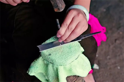 戶撒刀的制作工藝包括下料、制坯、打烊、修磨、飾葉、淬火、拋光、做柄、制帶、組裝等 10 道工序,細分的話有上百道工序。許喃元的父親最拿手的絕活就是精加工當中的走銅工藝。當時掌握這項工藝的工匠鳳毛麟角。走銅工藝是給刀身的鏨刻花紋渡上一層金色,在成型的刀上均勻的涂上黃銅粉末,然后拿到松碳上烤,可以讓刀看起來更絢麗。這項技術(shù)考驗的是銅的配方以及烤時溫度的把控,溫度掌控好了,刀的受熱均勻了,走出來的銅才夠華麗。在戶撒鄉(xiāng),會雙面走銅工藝的人很少。但是,戶撒刀的技藝一般都是傳男不傳女的,年輕的她卻認為現(xiàn)在是新時代了,要勇于打破舊觀念。作為女性,雖然力量懸殊沒有直接參與捶打的這項工藝過程,但她認為研磨、拋光、還有父親的走銅技藝自己是完全可以掌握的。于是,她決定學習父親的這項技藝,經(jīng)過死磨硬泡,父親終于拗不過倔強的她,便把配方及技藝精髓教授給了她。