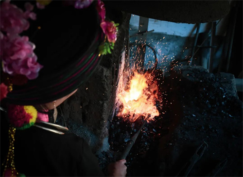 許喃元是縣級傳承人,也是現(xiàn)有的唯一一個阿昌族戶撒刀鍛制技藝非遺女傳承人。她出身于打刀世家。父親許保和是戶撒鄉(xiāng)芒炳村芒旦寨子有名的刀匠,從小在父親的影響下,她與戶撒刀之間有了不可分割的情緣。她從小就站在父親身邊,看父親是如何鍛刀制刀,許喃元說:“在我的童年里,寨子里的三十多戶人家都打刀,小錘與大錘相互交替捶打發(fā)出叮叮當當?shù)穆曇簦谡麄€寨子上空回蕩,很有節(jié)奏、很有韻律,這個聲音是我童年記憶里最美的旋律,甚至覺得它比童年那些耳熟能詳?shù)母枨家獎勇??!痹诟赣H的影響下,她也對打刀產(chǎn)生了濃厚的興趣。
