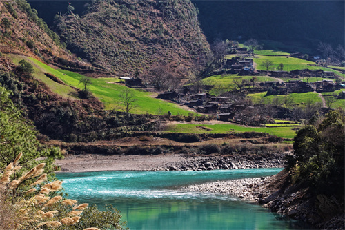 快到丙中洛,先經(jīng)過怒江第一灣,江灣環(huán)繞的半島形似馬蹄狀,上面坐落著一個名為坎桶村的小村子,散布著農(nóng)田、人家,云霧繚繞江水奔流,與碧玉般的江水相映生輝,宛若峽谷桃源,這里也被稱作“桃花島”。一路來到丙中洛,在這里用眼睛看那自然風(fēng)光,用耳朵聽怒族民歌,再用心、用舌尖慢慢品味怒家原生態(tài)美食。這里是美麗公路騎行的終點,被稱為“人神共居”的世外桃源,十座神山包圍著它,遺世獨立般地坐落在怒江邊上,這里的建筑形式、服飾民俗等,都有著濃郁的民族特色。丙中洛北側(cè),是石門關(guān)。兩側(cè)直插云霄的峭壁恢弘壯闊,一眼都不足以將石門關(guān)的磅礴氣勢收盡,在這里可以體會“一夫當(dāng)關(guān),萬夫莫開”的險峻。