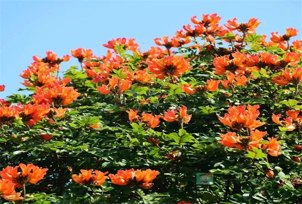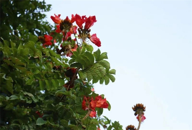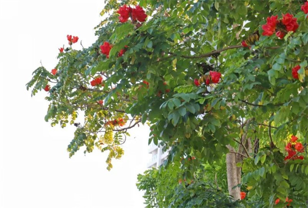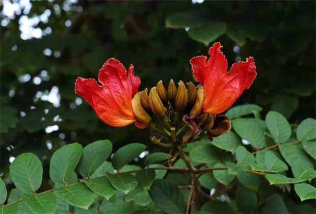 火焰樹(shù)屬喬木,樹(shù)干高大、樹(shù)冠茂盛,常被作為行道樹(shù)和蔭庇樹(shù)。火焰樹(shù)有著火焰花、火焰木的別稱(chēng),花期主要在冬春季之間,因綻放的花朵形如火炬,深紅色的花瓣邊緣有一圈金黃色的花紋,異常絢麗。遠(yuǎn)遠(yuǎn)望去,生長(zhǎng)在枝頭的火焰花如一只點(diǎn)燃的火炬一般,因此火焰花也被人們形象地稱(chēng)之為“冬天里的一把火”。