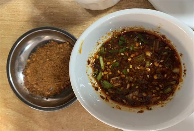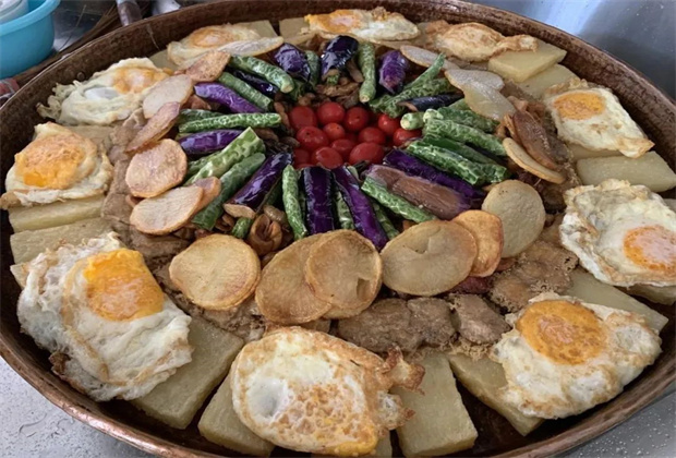以古老的銅鑄鑄造方法制作的“平壩鏊鍋”,鍋底用于煎烤或水煮食物,鍋面用于放置從鍋底制好的菜肴,以烤制平壩臭豆腐、豌豆粉為主,還有雞肉、排骨、雞蛋、瓜、韭菜等美食葷素搭配,紫色茄子與綠色辣椒相間并呈花瓣盛開(kāi)狀擺放,鍋的正中間放上鮮紅欲滴的小番茄,香氣四溢,色鮮味美,惹人垂涎欲滴。