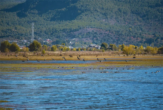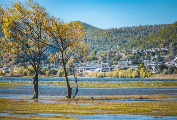 麗江有片“?!?,名叫拉市海。海邊的樹木黃綠交接,馬兒也在冬日悠閑覓食,享受岸邊的鮮