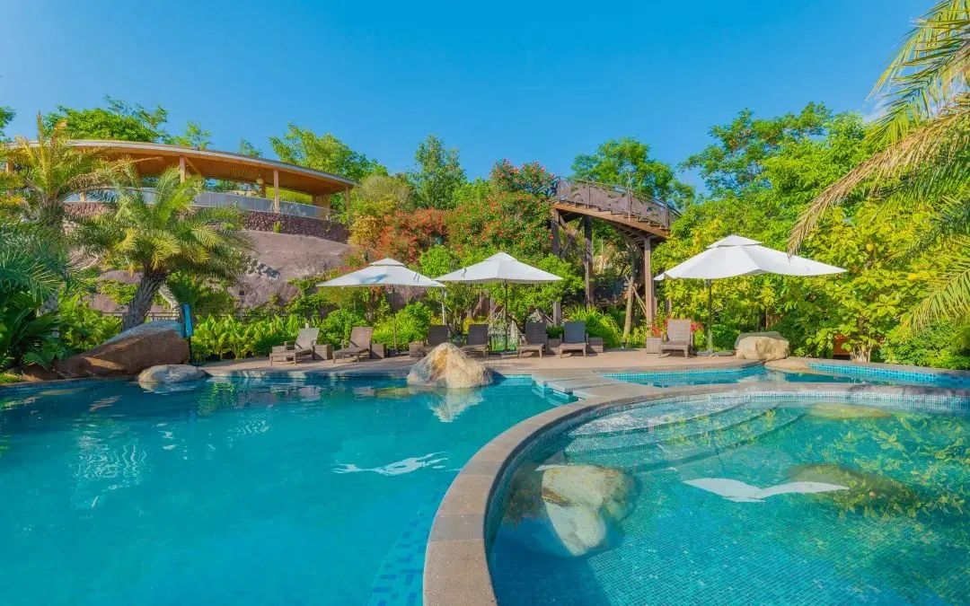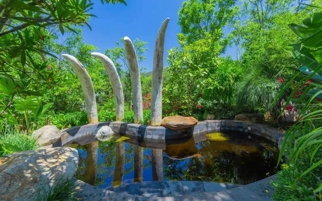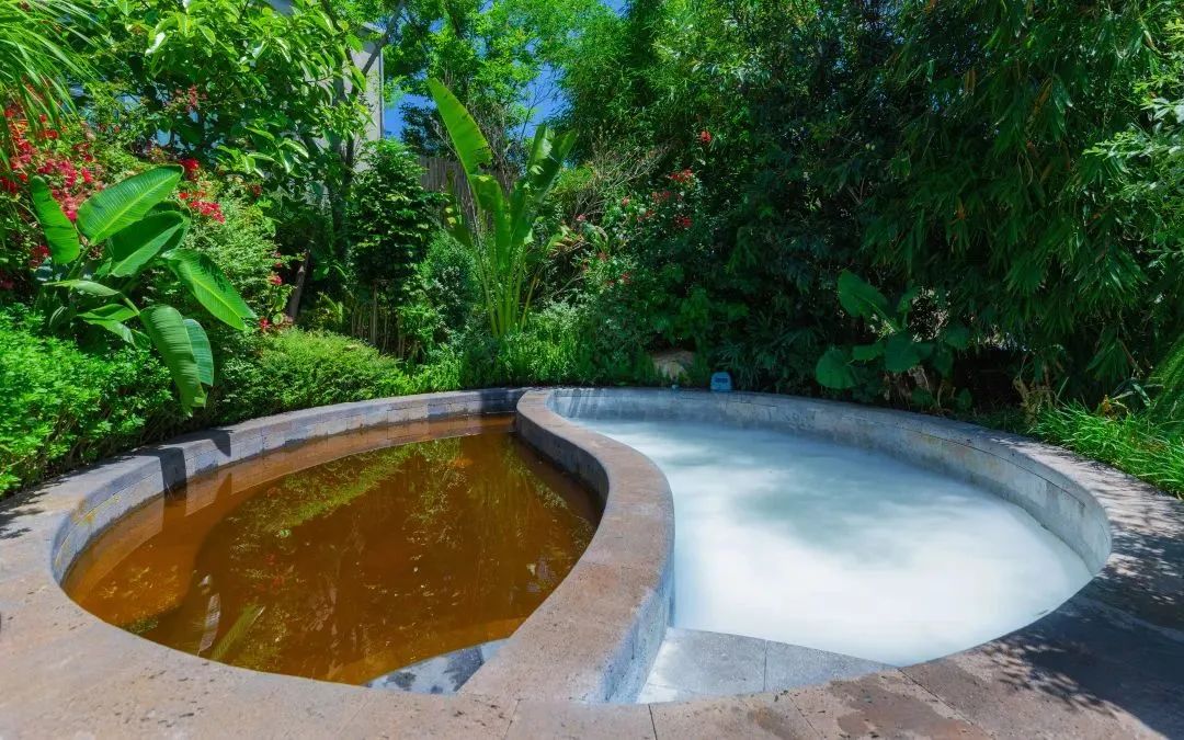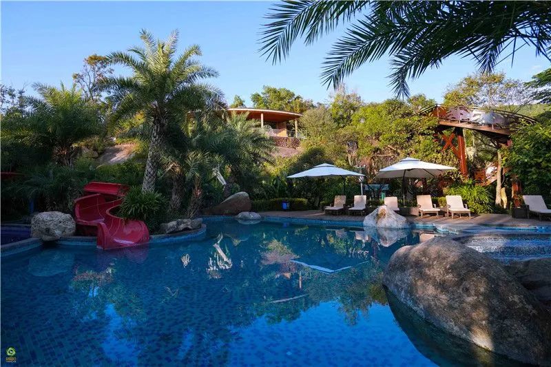 紅酒池、牛奶池、恐龍蛋池等38個功能各異的泡池鑲嵌在密林中,步入石子小道,穿過灌木叢林,