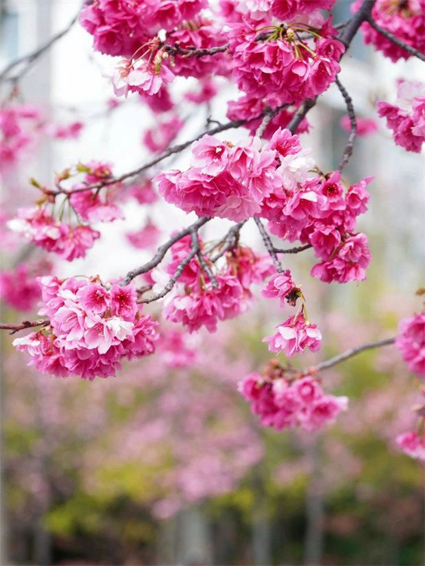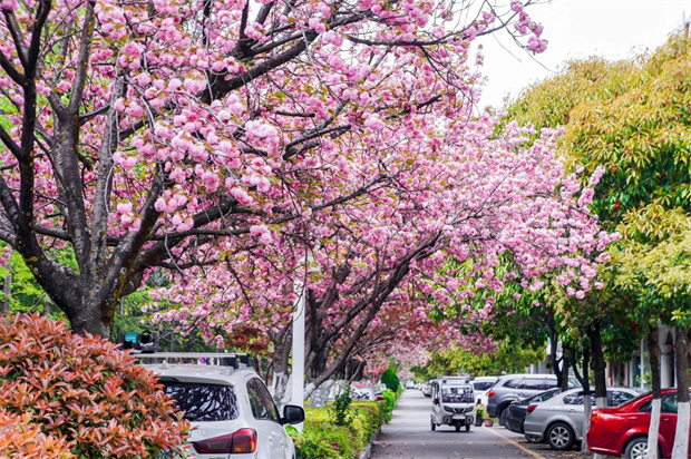 ,多了幾分悠然的詩意。高樓大廈間,櫻花的粉嫩打破了建筑的硬朗線條,讓這條繁華的大道滿是春日的靈動(dòng)。