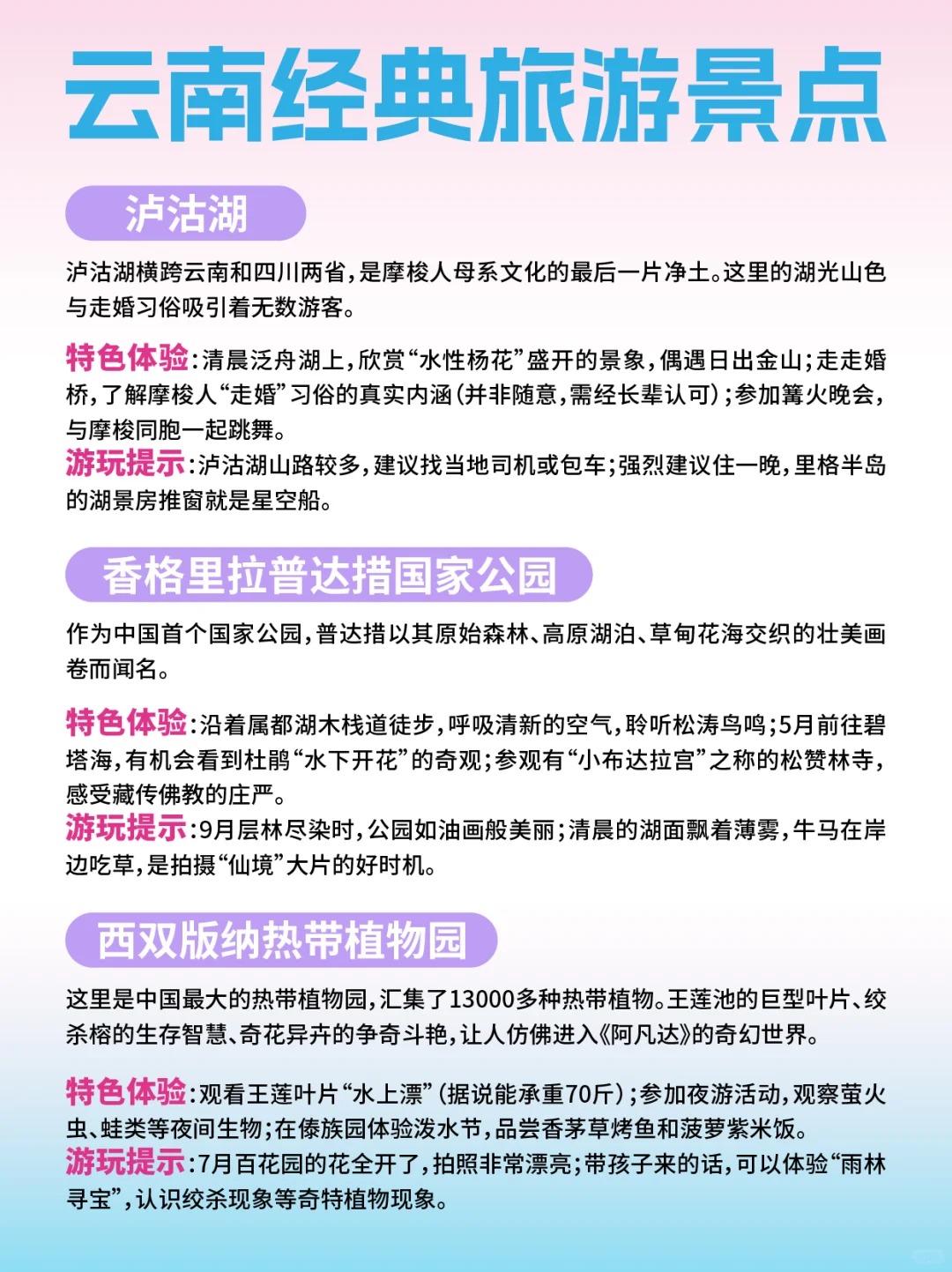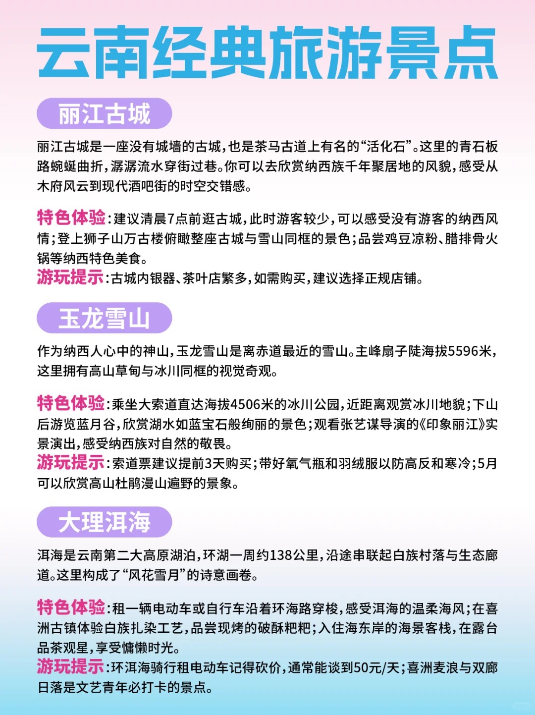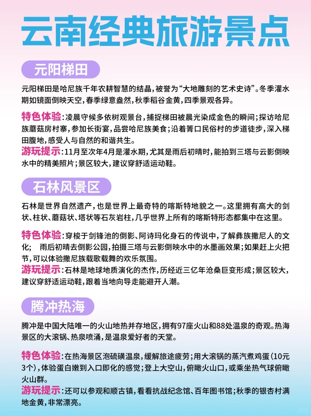 想來云南旅游的小伙伴,這是一份云南經(jīng)典旅游景點的詳細介紹,希望能幫助你更好地規(guī)劃行程